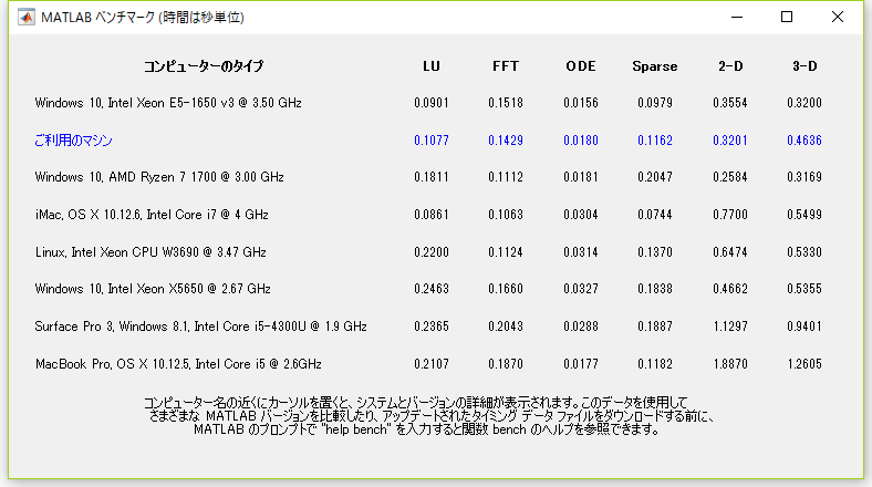 投稿日: 2018年5月3日2018年5月4日MATLAB ベンチマーク MATLAB ではベンチマークテストの結果をレポートしてくれる。 > bench ans = 0.1077 0.1429 0.0180 0.1162 0.3201 0.4636 自分のPCだとこんな感じ。まあまあかな。 ベンチマークテストの結果(時間:秒) ベンチマークテスト(相対比較グラフ)